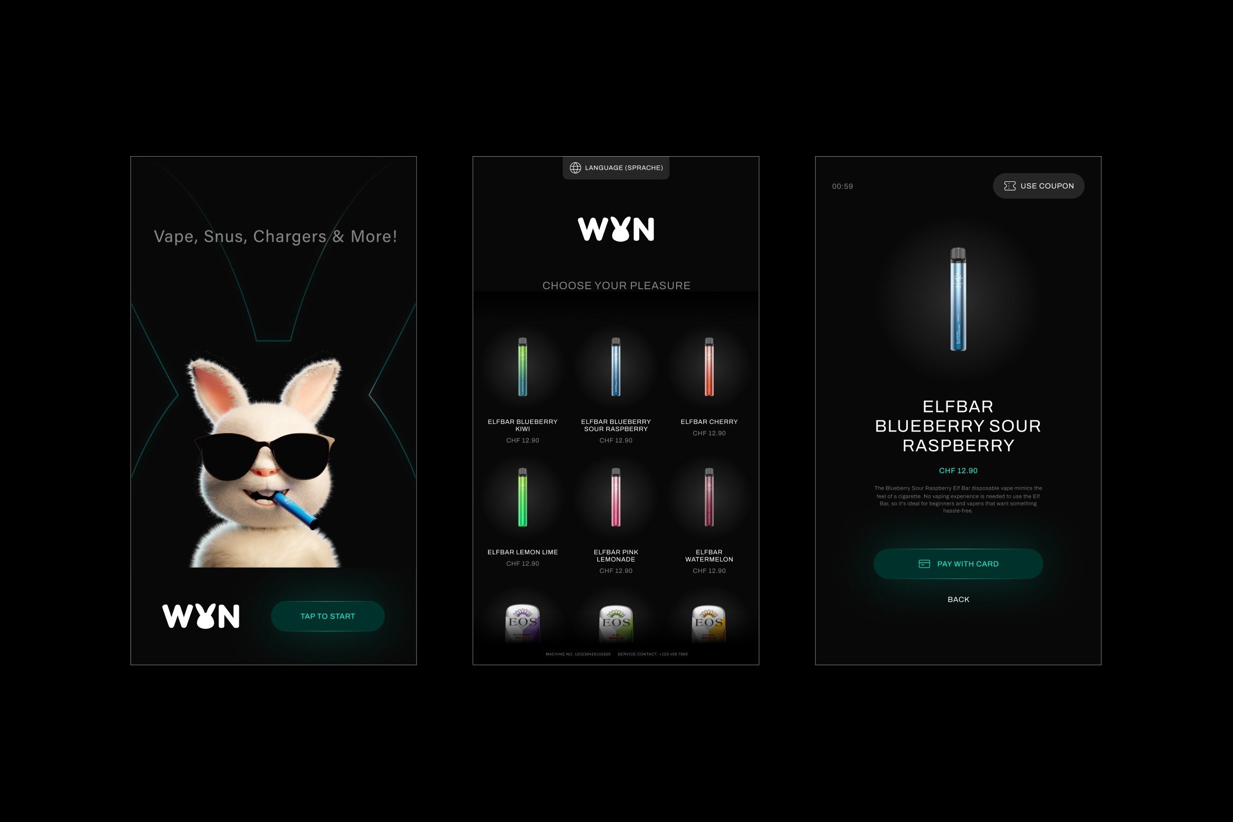 The final UI system uses a black-first palette, clear hierarchy, and strong emphasis states to guide users through selection and payment. Motion was designed as functional feedback, not decoration, making the experience feel alive while staying fast. The machine screen now reads well in real club conditions and supports the brand presence.